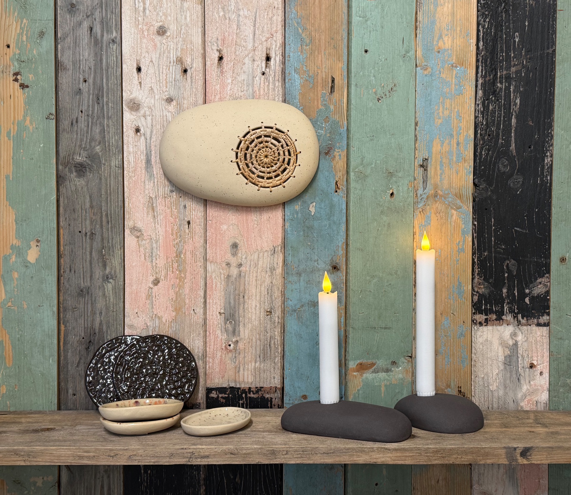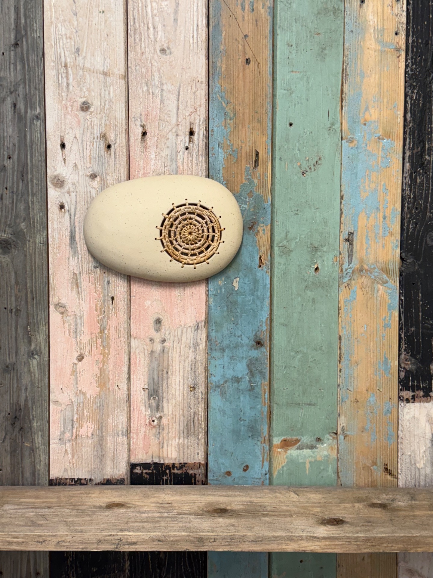 Seaidnehearva er mitt svar på pyntefat til veggoppheng. Seaidnehearva er håndlaget av keramikk og veaddi/tæger.