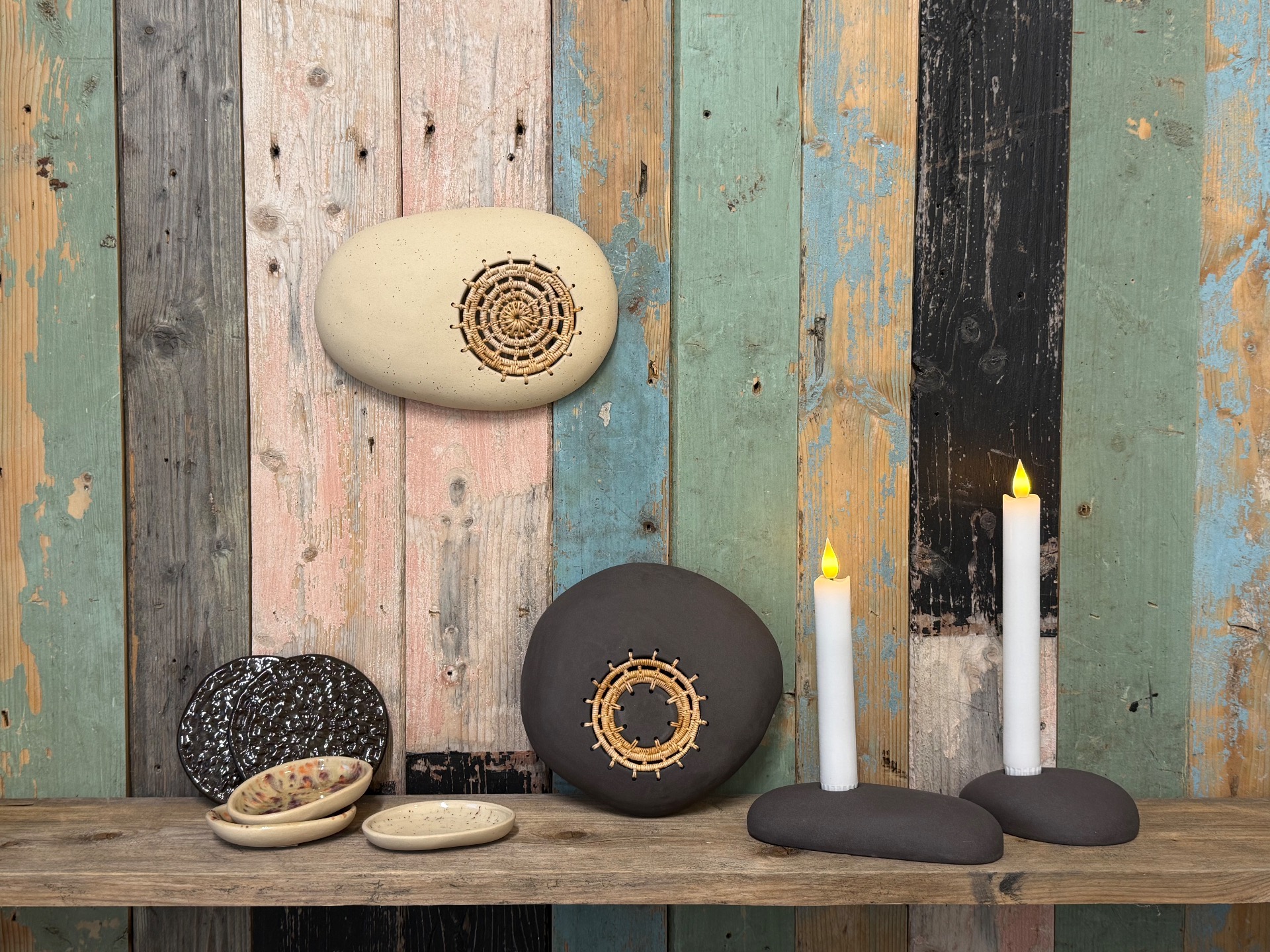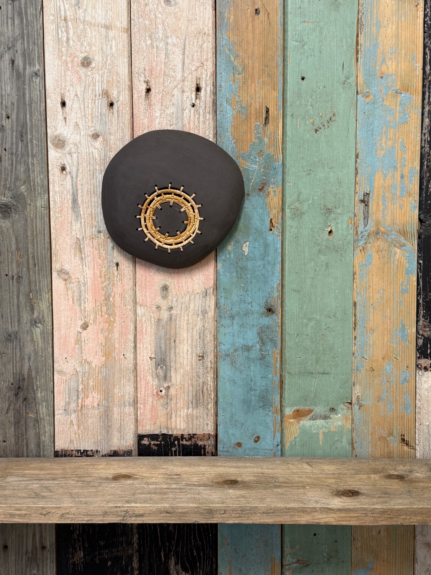 Seaidnehearva er mitt svar på pyntefat med dekor til veggoppheng. Håndlaget av sort keramikk og veaddi/tæger.